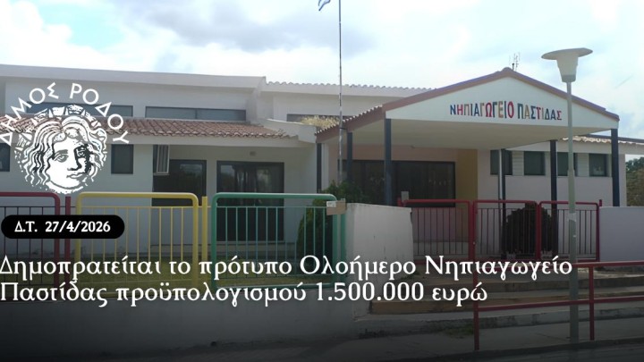 Επικαιρότητα 27.04.2026 16:54 Δημοπρατείται από τον Δήμο Ρόδου το πρότυπο Ολοήμερο Νηπιαγωγείο Παστίδας προϋπολογισμού 1.500.000 ευρώ