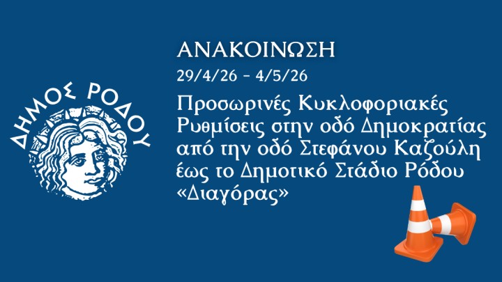 Επικαιρότητα 28.04.2026 19:15 Προσωρινές κυκλοφοριακές ρυθμίσεις στην οδό Δημοκρατίας από την οδό Στεφάνου Καζούλη έως το Δημοτικό Στάδιο Ρόδου «Διαγόρας»