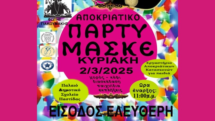 Πολιτισμός - Εκδηλώσεις 19.02.2025 21:00 Αποκριάτικο Πάρτι στην Κεντρική Πλατεία Ιαλυσού το Σάββατο 1 Μαρτίου