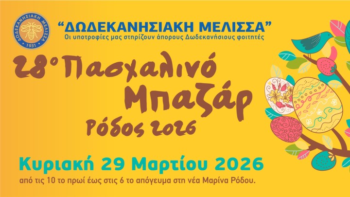 Επικαιρότητα 20.03.2026 14:30 Η Δωδεκανησιακή Μέλισσα – Επιτροπή Ρόδου διοργανώνει το 28ο Πασχαλινό Μπαζάρ της