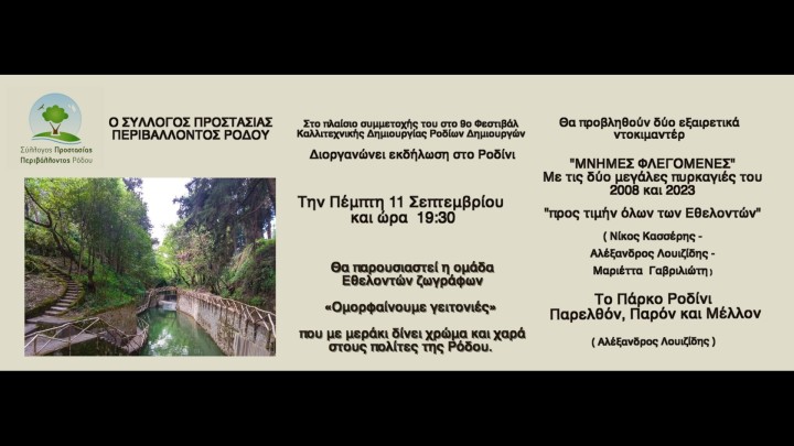 Επικαιρότητα 10.09.2025 16:00 Εκδήλωση του Συλλόγου Προστασίας Περιβάλλοντος Ρόδου στο πλαίσιο της συμμετοχής του στο 9ο Φεστιβάλ Καλλιτεχνικής Δημιουργίας Ροδίων