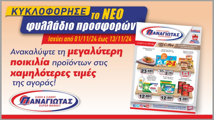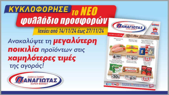 Επιχειρείν 28.11.2024 11:00 Super Market ΠΑΝΑΓΙΩΤΑΣ: Νέο Φυλλάδιο Προσφορών – Η Εορταστική περίοδος ξεκίνησε με απίστευτες τιμές!