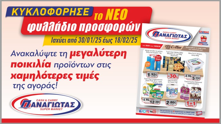 Market 30.01.2025 09:00 Super Market ΠΑΝΑΓΙΩΤΑΣ: Νέο Φυλλάδιο Προσφορών - Ανακαλύψτε τις χαμηλότερες τιμές της αγοράς!
