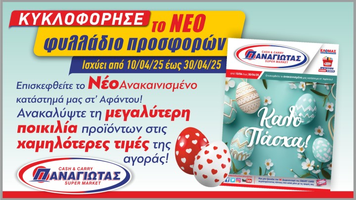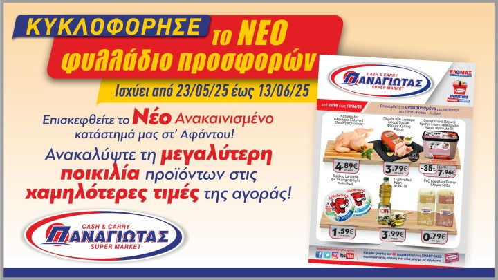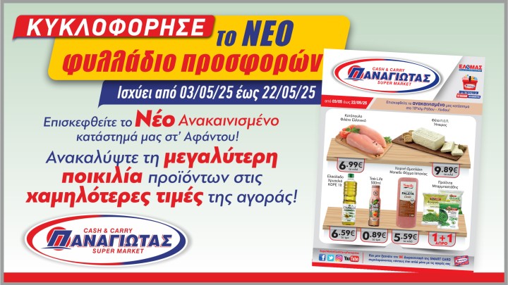 Market 03.05.2025 09:41 Super Market ΠΑΝΑΓΙΩΤΑΣ: Νέο Φυλλάδιο Προσφορών!-Ανακαλύψτε τις καλύτερες τιμές από 3/5 έως 22/5/2025!