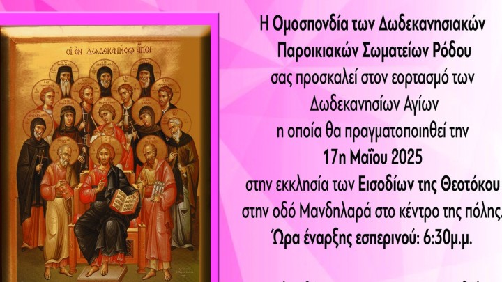 Πολιτισμός - Εκδηλώσεις 16.05.2025 15:30 Αύριο ο εορτασμός των Δωδεκανησίων Αγίων στην εκκλησία των Εισοδίων της Θεοτόκου
