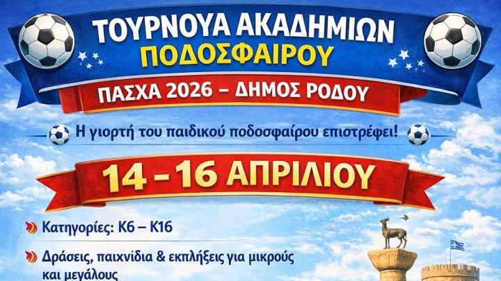 Αθλητικά 26.03.2026 18:00 Από τις 14 έως τις 17 Απριλίου το 33ο Τουρνουά Ακαδημιών Ποδοσφαίρου "Πάσχα 2026"