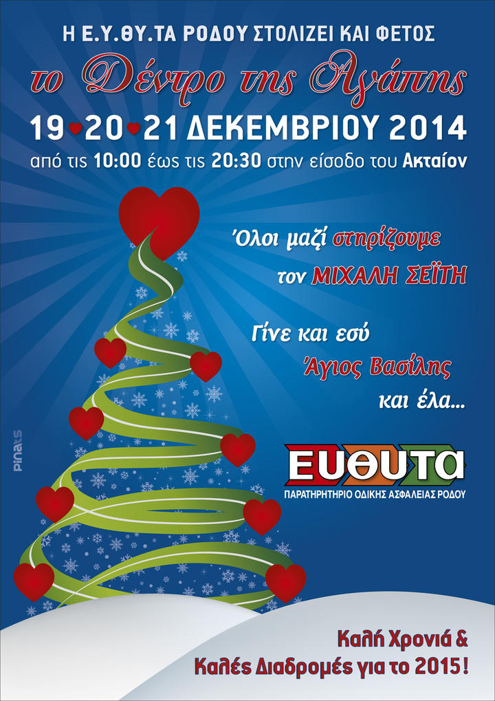 Ας γίνει το σύνθημά μας αυτά τα Χριστούγεννα: « Στολίδια στο Δέντρο της Αγάπης, στολίδια στο Δέντρο της ΕΥΘΥΤΑ ΡΟΔΟΥ, οι αξίες μας, το φως στη ζωή μας, το φως της αλληλεγγύης, το φως στη συμμετοχή του Μιχάλη Σεϊτη»