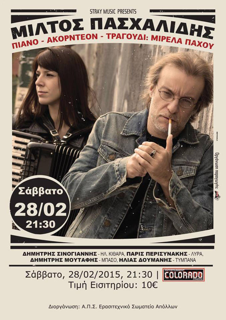 ο Μίλτος Πασχαλίδης κατηφορίζει στη Ρόδο, για μία μοναδική εμφάνιση, το Σάββατο 28 Φεβρουαρίου, στο Colorado, μαζί με την αγαπημένη μας Μιρέλα Πάχου και 4 κορυφαίους μουσικούς.