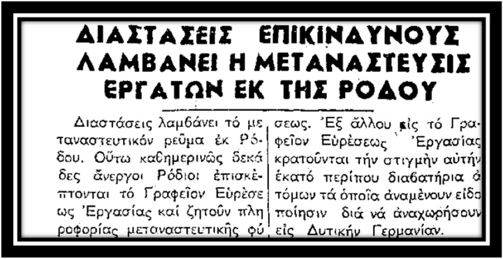 Από την Ροδιακή της 28ης Οκτωβρίου 1964 το «αλιεύσαμε». Πριν από 51 ολόκληρα χρόνια. Τότε που και πάλι, οι πολιτικές των… συμμάχων, σε πλήρη συνεργασία με τις εγχώριες κυβερνήσεις, ξερίζωναν οικογένειες, νέους, παιδιά, μανάδες και έστελναν στις φάμπρικες της Γερμανίας και του Βελγίου τις στοές, το πιο δυναμικό και παραγωγικό κομμάτι της Ρόδου και της Δωδεκανήσου. Για το… καλό μας και τότε.