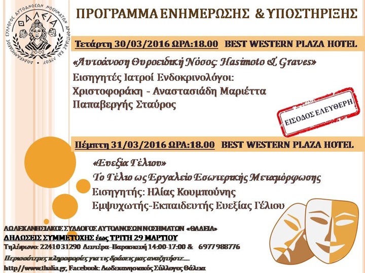 Από το Δωδεκανησιακό σύλλογο αυτοάνοσων νοσημάτων αρθρίτιδας και λύκου «ΘΑΛΕΙΑ» εκδόθηκε η παρακάτω ανακοίνωση: «Αγαπητοί μας φίλοι, Ο κύκλος των προγραμμάτων Ενημέρωσης & Υποστήριξης για τα αυτοάνοσα νοσήματα και τις χρόνιες παθήσεις, με την συμμετοχή ιατρών και ειδικευμένων θεραπευτών, συνεχίζεται από τον Δωδεκανησιακό Σύλλογο Αυτοάνοσων Νοσημάτων Αρθρίτιδας & Λύκου «ΘΑΛΕΙΑ».