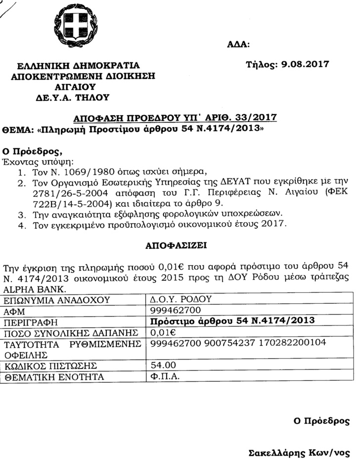 Το διαβάσαμε και δεν το πιστεύαμε! Στο δήμο Τήλου, επιβλήθηκε πρόστιμο 0,01 ευρώ (!), σύμφωνα με το άρθρο 54 του Νόμου 4174/2013 για ΦΠΑ.