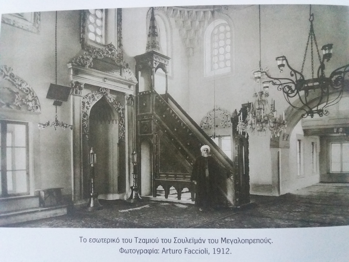 Χτίστηκε από τον ίδιο το Σουλεϊμάν τον Μεγαλοπρεπή στη θέση της εκκλησίας των Αγίων Αποστόλων, όπως όμως πιστεύεται έπεσε και ξαναχτίστηκε στα 1808. Βρίσκεται στην οδό Σωκράτους, ψηλά κοντά στον πύργο Ωρολογιού, κι έχει μια αυλή με πλατάνια και «φιάλη» για το καθάρισμα των πιστών σύμφωνα με τη μουσουλμανική συνήθεια που ήταν και βυζαντινή. Στην πόρτα έχουν χρησιμοποιήσει ένα ωραίο μαρμάρινο πλαίσιο, ρυθμού Αναγέννησης σαν βενετικό, κολόνες με γιρλάντες ανάγλυφες μπροστά σε παραστάδες με κεφαλές Χερουβείμ, κλεψύδρες, πανοπλίες και άλλα πολεμικά σύμβολα που φαίνεται ότι τα πήραν από κάποιο επιτύμβιο μνημείο εκκλησίας.