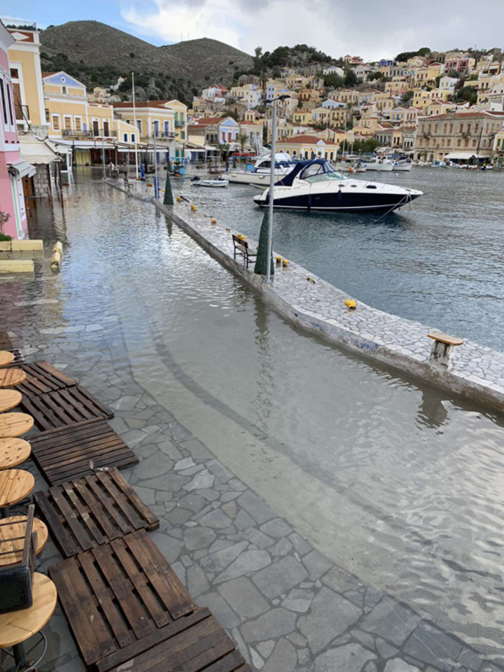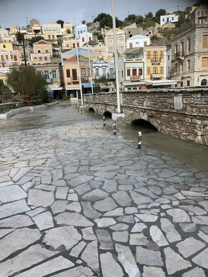Πλημμύρισε ολόκληρος ο κεντρικός δρόμος του λιμανιού της Σύμης.