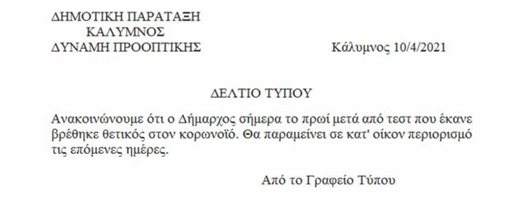 Από το Γραφείο τύπου της Δημοτικής Παράταξης «ΚΑΛΥΜΝΟΣ ΔΥΝΑΜΗ ΠΡΟΟΠΤΙΚΗΣ» εκδόθηκε ανακοίνωση στην οποία αναφέρεται ότι ο Δήμαρχος σήμερα Σάββατο(10-3-2021) πρωί μετά από τεστ που έκανε βρέθηκε θετικός στον κορωνοϊό.