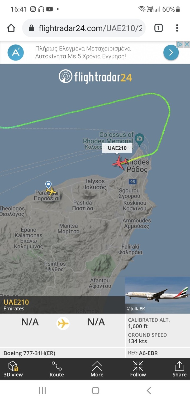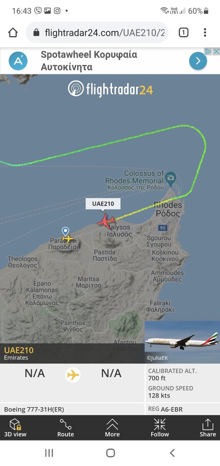 Πρόκειται για την πτήση UAE 210, στον κυβερνήτη του οποίου δόθηκε εντολή να κατευθυνθεί στο αεροδρόμιο της Ρόδου, προκειμένου να έχει μια ασφαλή προσγείωση.