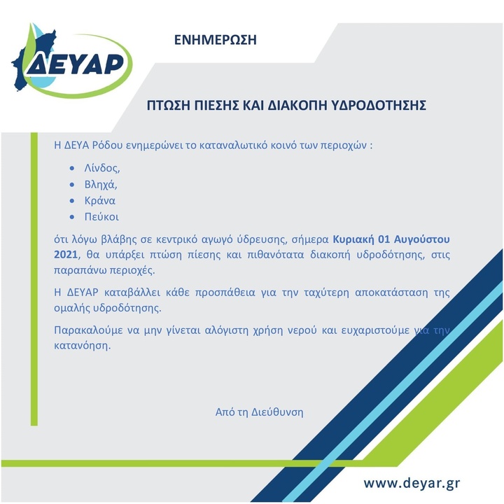 Χωρίς νερό βρίσκονται από το πρωί οι περιοχές Λίνδος- Πεύκοι- Βληχά- Κράνα εξαιτίας βλάβης. Σύμφωνα με την ανακοίνωση της ΔΕΥΑΡ, η βλάβη αναμένεται να αποκατασταθεί μέσα στην ημέρα.