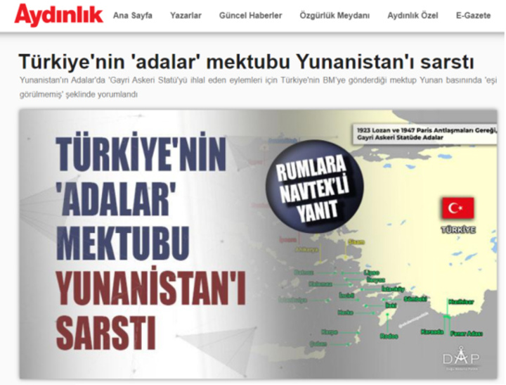 «Η επιστολή της Τουρκίας στον ΟΗΕ δημιούργησε ένα σοκ στην Αθήνα. Η προσέγγιση της Τουρκίας ότι «εάν αφαιρεθεί η κατάσταση μεταβίβασης των Νήσων, θα εξαφανιστεί και η ελληνική κυριαρχία» προκάλεσε πανικό στην Ελλάδα» αναφέρει χαρακτηριστικά η εφημερίδα στο γνώριμο υπερβολικό ύφος προς δημιουργία εντυπώσεων, δημοσιεύοντας και χάρτη με τα νησιά του Αιγαίου, σημειώνοντας ποια από αυτά είναι στρατιωτικοποιημένα.