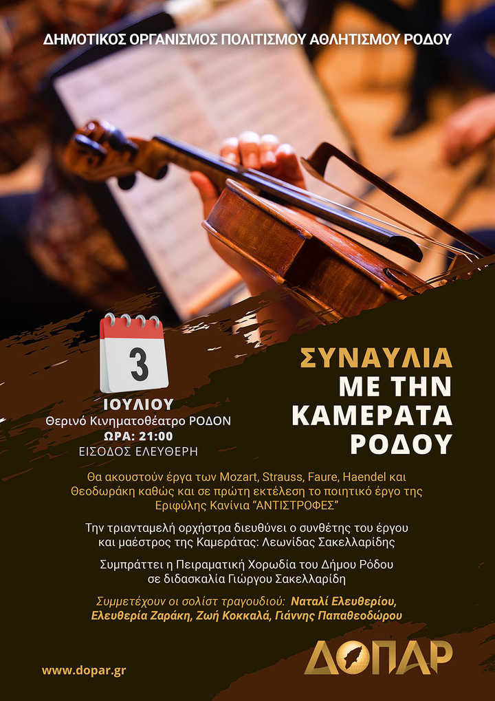 Ο Δημοτικός Οργανισμός Πολιτισμού – Αθλητισμού Ρόδου στο πλαίσιο των καλοκαιρινών πολιτιστικών εκδηλώσεων 2022 διοργανώνει συναυλία με την Καμεράτα Ρόδου.