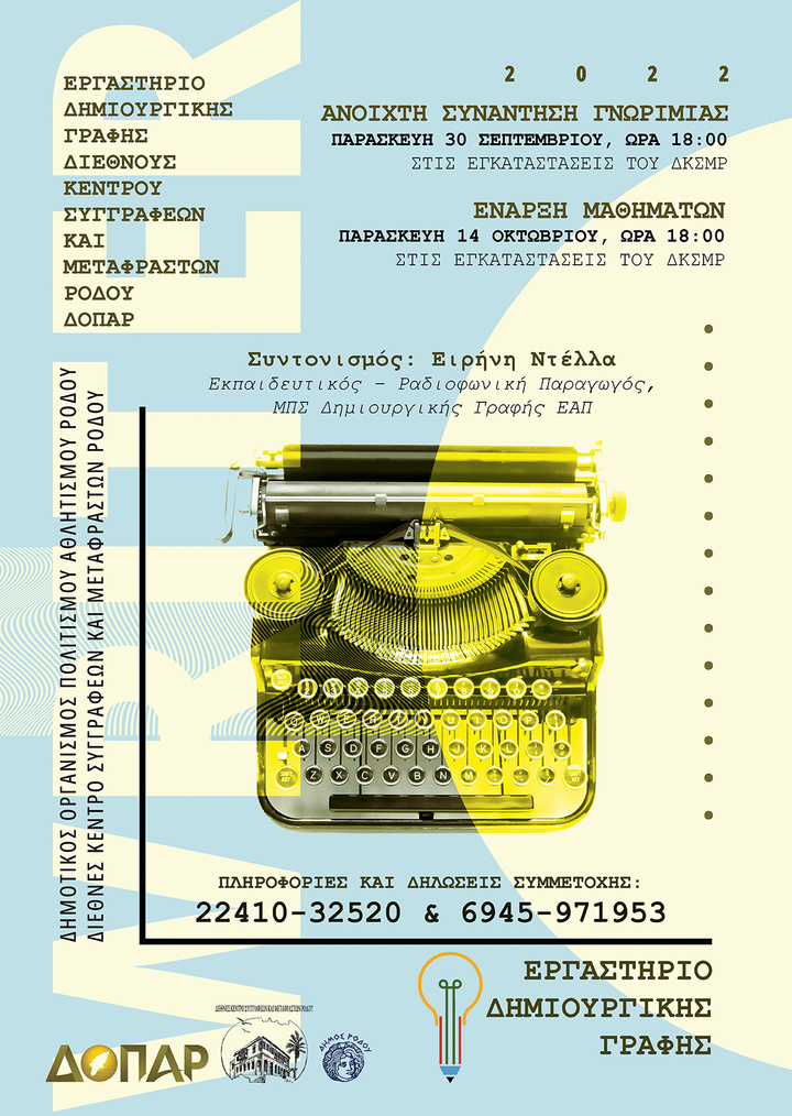 Το ΔΚΣΜΡ – ΔΟΠΑΡ στηρίζει τη δράση και παραχωρεί το χώρο στις εγκαταστάσεις του επί της οδού Αντιπλοιάρχου Λάσκου 10α για την πραγματοποίηση των συναντήσεων και την υλοποίηση του Εργαστηρίου Δημιουργικής Γραφής.