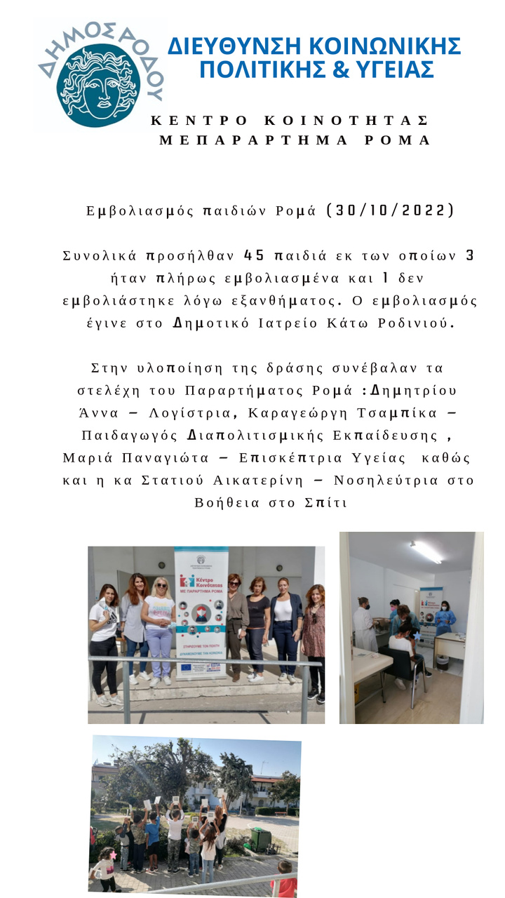 Σαράντα πέντε παιδιά Ρομά εμβολιάστηκαν την περασμένη Κυριακή, 30 Οκτωβρίου, στο πλαίσιο δράσης του Κέντρου Κοινότητας με Παράρτημα Ρομά της Διεύθυνσης Κοινωνικής Πολιτικής του δήμου της Ρόδου.