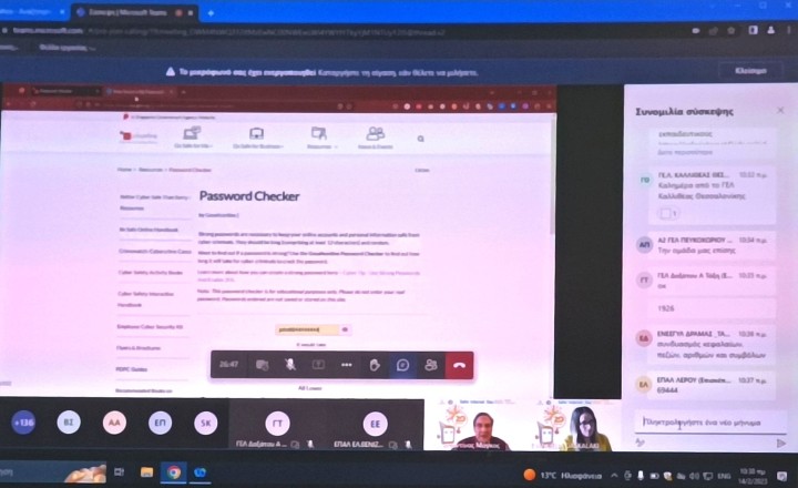 Στη συνέχεια, την Τρίτη 14 Φεβρουαρίου, το σχολείο μας συμμετείχε στην εκδήλωση που διοργανώθηκε από το Ελληνικό Κέντρο Ασφαλούς Διαδικτύου του ΙΤΕ και την Εθνική αρχή Κυβερνοασφάλειας του υπουργείου Ψηφιακής Διακυβέρνησης για την αντιμετώπιση ζητημάτων ασφαλείας που αφορούν την προστασία της καθημερινότητάς μας στο διαδίκτυο, το οποίο απευθυνόταν τόσο στους μαθητές-τριες, όσο και στους εκπαιδευτικούς.