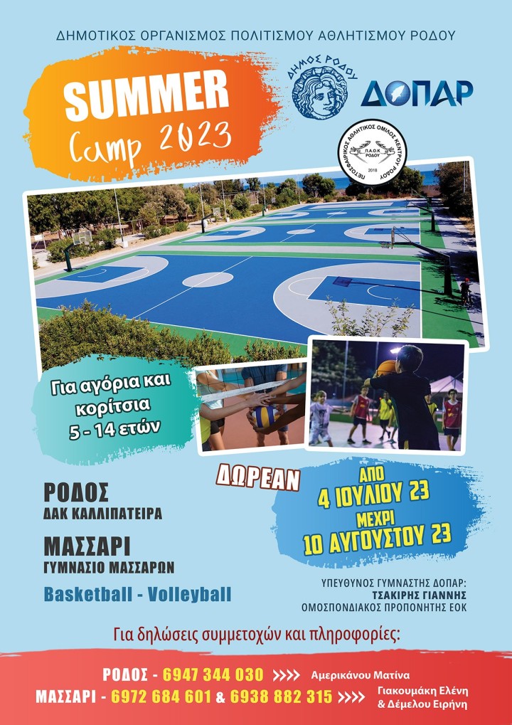 Ο ΔΟΠΑΡ σε συνεργασία με το αθλητικό σωματείο ΠΑΟΚ Ρόδου ανακοίνωσαν χθες την έναρξη του Summer Camp βόλεϊ και μπάσκετ με δωρεάν προπονήσεις για παιδιά από 5-14 ετών, στα ανοιχτά γήπεδα του ΔΑΚ «Καλλιπάτειρα» και του Γυμνασίου Μασσάρων, από 4 Ιουλίου έως 10 Αυγούστου.