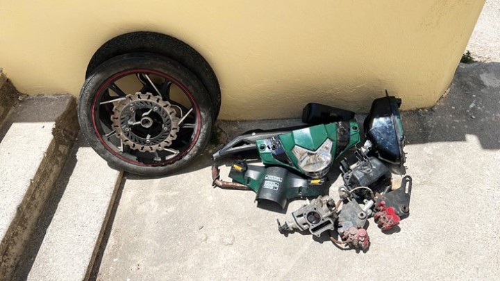 Μάλιστα σε αποθηκευτικό χώρο που χρησιμοποιούσε ο ανήλικος, βρέθηκαν και κατασχέθηκαν φανάρια, καντράν, πλαστικά καλύμματα και προστατευτικά μέρη, κάθισμα, ντεπόζιτα βενζίνης, σχάρες, εξατμίσεις, ρόδες, αμορτισέρ, εξαρτήματα φρένων, καλώδια, φίλτρα καρμπιρατέρ, μοτοποδήλατο με απόξεση στον αριθμό πλαισίου και κινητήρα, σκελετός μοτοσικλέτας με απόξεση στον αριθμό πλαισίου, κ.α.