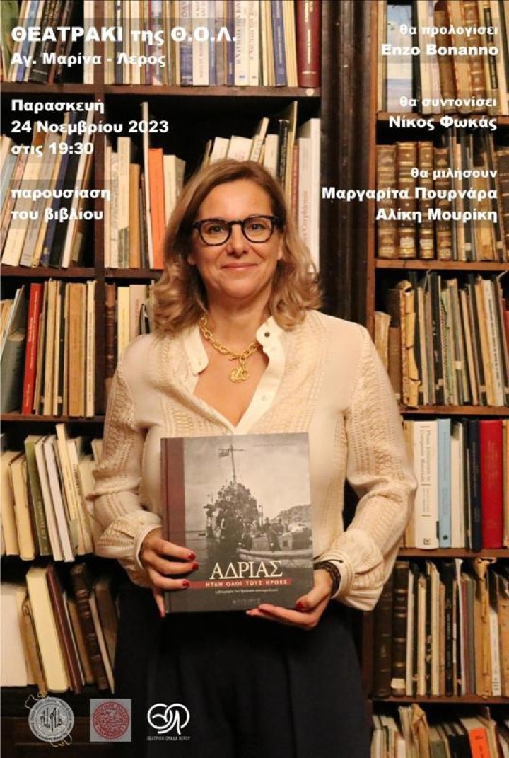 Η Θεατρική Ομάδα Λέρου και ο Ιταλοελληνικός πολιτιστικός σύλλογος AIAL διοργανώνουν την παρουσίαση του βιβλίου της δημοσιογράφου και συγγραφέως Μαργαρίτας Πουρνάρα «ΑΔΡΙΑΣ – Ήταν όλοι τους ήρωες», που θα πραγματοποιηθεί την Παρασκευή 24 Νοεμβρίου και ώρα 19.30 στο θεατράκι της θεατρικής ομάδας στην Αγία Μαρίνα.