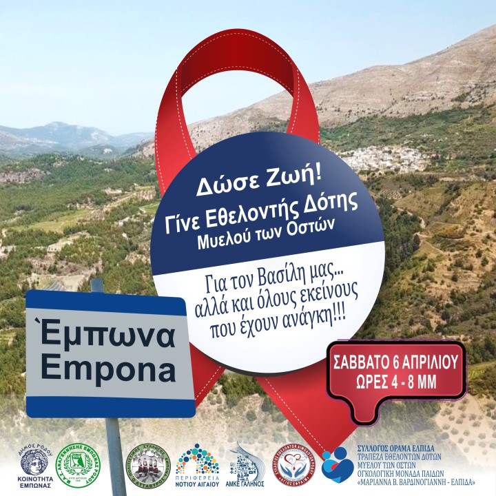 Η Κοινότητα Έμπωνας με τους Αθλητικό Σύλλογο «Αναγέννηση» και τον Πολιτιστικό Σύλλογο «Ο Αττάβυρος» της περιοχής, σε συνεργασία με την περιφέρεια Νοτίου Αιγαίου, την ΑΜΚΕ ΓΑΛΗΝΟΣ, τον Σύλλογο Αιμοδοτών Ρόδου και το ΟΡΑΜΑ ΕΛΠΙΔΑ της Ογκολογικής Μονάδας Παίδων «ΜΑΡΙΑΝΝΑ Β. ΒΑΡΔΙΝΟΓΙΑΝΝΗ - ΕΛΠΙΔΑ» διοργανώνουν ημέρα δωρεάς μυελού των οστών, το ερχόμενο Σάββατο, 6 Απριλίου 2024 στην Έμπωνα.