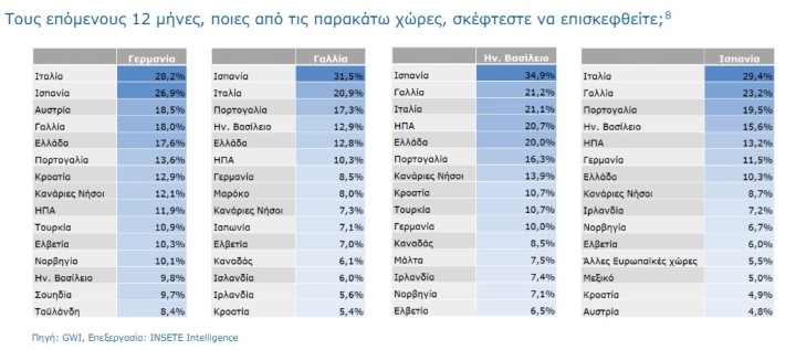 Ειδικότερα, η Ελλάδα βρίσκεται στην 5η θέση για τις αγορές της Γερμανίας, της Γαλλίας και του Ηνωμένου Βασιλείου και στην 7η θέση για την αγορά της Ισπανίας, όσον αφορά την πραγματοποίηση ταξιδιού τους επόμενους 12 μήνες. Η διαφορά ωστόσο μεταξύ της Ελλάδας και των χωρών που προηγούνται κατά μία ή δύο θέσεις είναι πολύ μικρή (της τάξεως της 1 ποσοστιαίας μονάδας ή λιγότερο) και οι χώρες αυτές είναι είτε πολύ μεγαλύτερες (π.χ. Γαλλία ή Ηνωμένο Βασίλειο) είτε πολύ πιο εύκολα προσβάσιμες ακόμα και οδικώς (π.χ. η Αυστρία από τη Γερμανία).