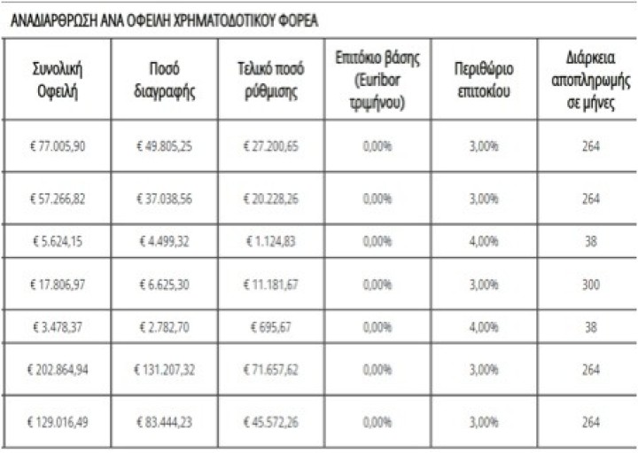 Στον πίνακα που ακολουθεί αναφέρονται αναλυτικά, όλες οι οφειλές του συμπολίτη μας, το ποσό διαγραφής που πέτυχε με τον εξωδικαστικό διακανονισμό, τα ποσά που θα κληθεί να πληρώσει σε συγκεκριμένα χρονικά διαστήματα (δόσεις), καθώς και το επιτόκιο των ποσών της αποπληρωμής.