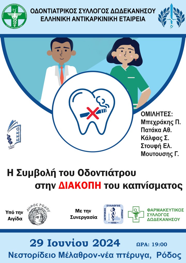 Στο πλαίσιο αυτό. ο Οδοντιατρικός Σύλλογος Δωδεκανήσου και η Ελληνική Αντικαρκινική Εταιρεία – Παράρτημα Ρόδου, με τη σύμπραξη του Ιατρικού Συλλόγου Ρόδου, προσκαλούν το κοινό της Ρόδου το Σάββατο 29 Ιουνίου 2024 στις 19:00, στη νέα πτέρυγα του Νεστορίδειου Μελάθρου (πρώην οδός Κω), για την εκδήλωση με θέμα: «Οι επιπτώσεις του καπνίσματος στη Στοματική Υγεία».