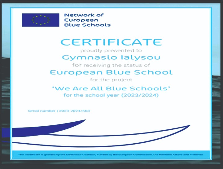 «Βρισκόμαστε στην ευχάριστη θέση να σας ενημερώσουμε πως το σχολείο μας εντάχθηκε στο Δίκτυο «Ευρωπαϊκών Μπλε Σχολείων», το σχολικό έτος 2023-2024. Ένα σχολείο που δρα για την προστασία του θαλάσσιου περιβάλλοντος, μια πρωτοβουλία του EU4Ocean Coalition.