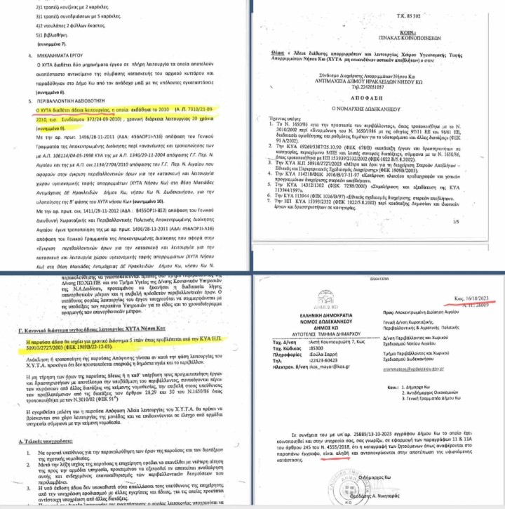Μια πραγματικότητα που περιγράφεται αναλυτικά στο ΦΕΚ 2703/Β’/09-05-2024, που αναφέρει ότι ο ΧΥΤΑ της Κω δεν διαθέτει Άδεια Λειτουργίας και σε αυτόν δεν λειτουργούν βασικές υποδομές που διασφαλίζουν την προστασία του περιβάλλοντος και της δημόσιας υγείας όπως Μονάδα Πυρόσβεσης - Πυρασφάλειας, ο Πυρσός καύσης βιοαερίου, και η Μονάδα Επεξεργασίας Στραγγισμάτων.