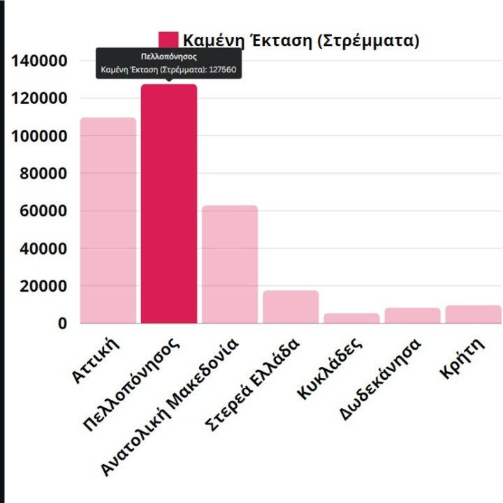 Όπως δείχνουν τα στοιχεία αυτά, στην Πελοπόννησο κάηκαν συνολικά 127.560 στρέμματα και ακολουθεί η Αττική με 109.710 καμένα στρέμματα. Τρίτη Περιφέρεια με περισσότερες καμένες εκτάσεις είναι η Ανατολική Μακεδονία Θράκη και τέταρτη η Στερεά Ελλάδα.