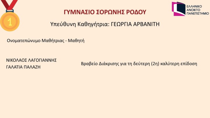 Η διευθύντρια του Σχολείου, κα Κατερίνα Δογιάμα-Μητσοπούλου απευθύνει «συγχαρητήρια σε όλους τους μαθητές και μαθήτριες που συμμετείχαν, για την προσπάθεια, τη συγκέντρωση και την ωριμότητα με την οποία προσέγγισαν το θέμα και για τη διάκρισή τους» και ευχαριστεί για την πολύτιμη βοήθειά της τη διδάσκουσα εκπαιδευτικό του μαθήματος, κα Αρβανίτη Γεωργία.