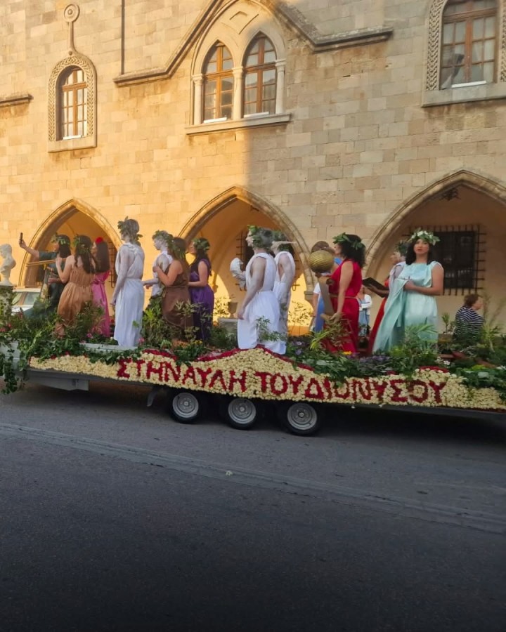 Οι συμμετέχουσες ομάδες σε μια πανδαισία χρωμάτων, κεφιού, λουλουδιών και αρωμάτων σκόρπισαν χαμόγελα και άνθη στον κόσμο, που χειροκροτούσε με ενθουσιασμό: μικρά παιδιά με λουλουδένια στεφανάκια, με καλαθάκια γεμάτα λουλούδια και πέταλα, μαζορέτες, ομάδες που γιόρτασαν τη Ρόδο των λουλουδιών και του ιβίσκου, καρότσια με μωρά και ποδήλατα ανθοστολισμένα, ροδίτικη αυλή με ευωδιαστά άνθη που θύμισε την εποχή που οι άνθρωποι ποσπέριζαν, σκόρδα καλαβαρδενά, φυτά και λουλούδια της παραλίας που είναι πολύτιμα είδη του παράκτιου οικοσυστήματός μας, μούσες και μαινάδες, γυναίκες στην αυλή του θεού Διονύσου.