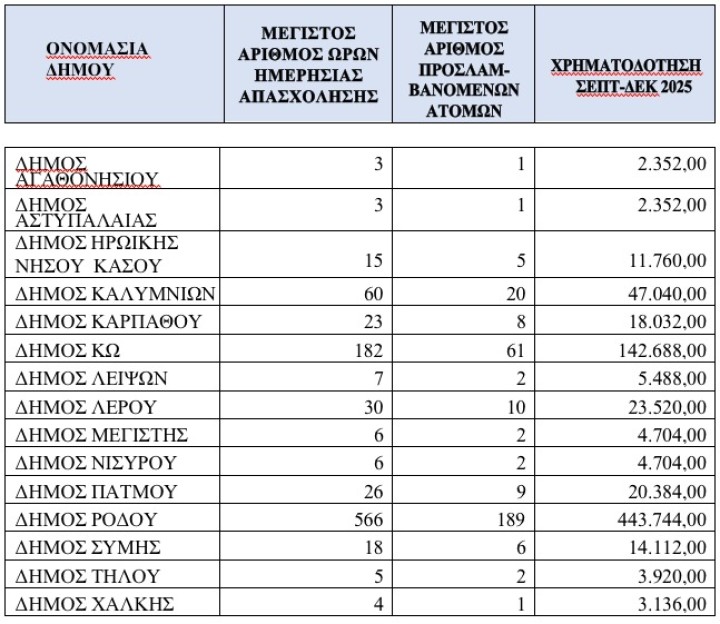 Σε ό,τι αφορά τους δήμους της Δωδεκανήσου, οι χρηματοδοτήσεις έχουν ως εξής: