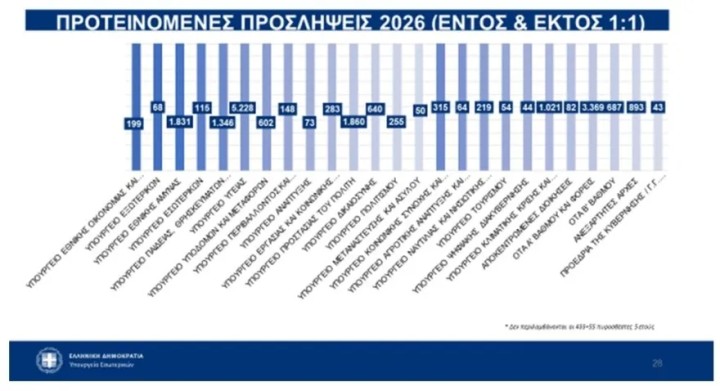 Σημειώνεται ότι ο προγραμματισμός των 19.489 προσλήψεων στο Δημόσιο για το 2026, αποτελεί συνέχεια των 122.203 προσλήψεων που έχουν εγκριθεί για τα έτη 2020 έως 2025 και άρα συνολικά 141.692 για το σύνολο της εξαετίας.