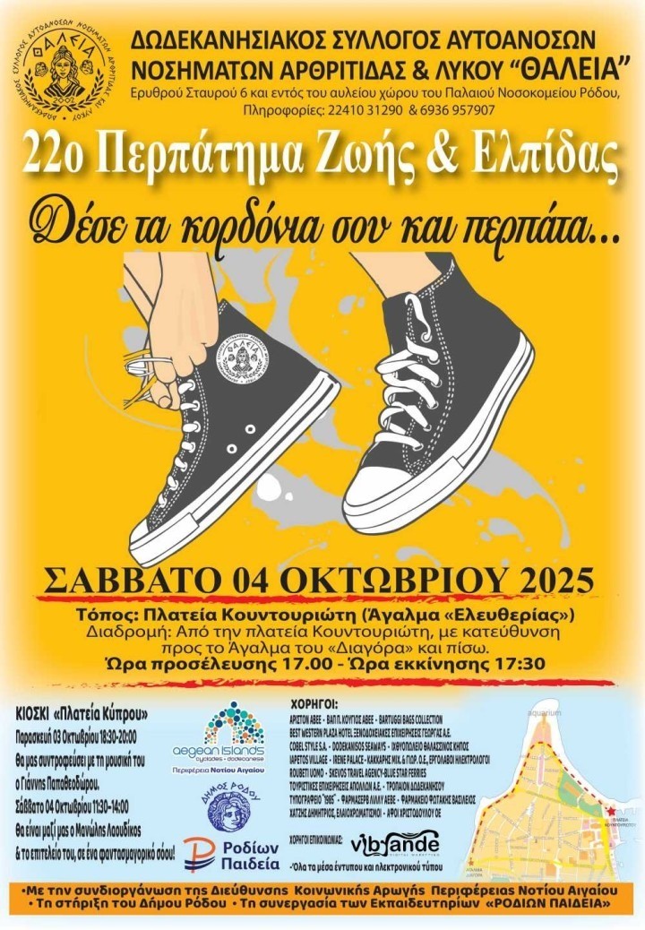 Για 22η συνεχή χρονιά, ο Δωδεκανησιακός Σύλλογος Αυτοάνοσων Νοσημάτων Αρθρίτιδας & Λύκου «ΘΑΛΕΙΑ» διοργανώνει το Περπάτημα Ζωής & Ελπίδας, στέλνοντας ένα ηχηρό μήνυμα για την ανάγκη ενημέρωσης, ευαισθητοποίησης και στήριξης γύρω από τα αυτοάνοσα νοσήματα, που πλήττουν χιλιάδες ανθρώπους σε καθημερινή βάση.