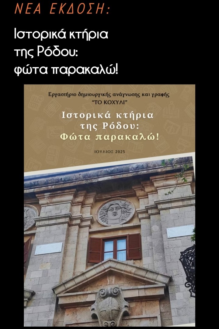 Το Εργαστήριο δημιουργικής ανάγνωσης και γραφής «ΤΟ ΚΟΧΥΛΙ» παρουσιάζει την ηλεκτρονική έκδοση του νέου συλλογικού έργου «Ιστορικά Κτήρια της Ρόδου: Φώτα παρακαλώ!» (ISBN: 978-618-87928-0-7).