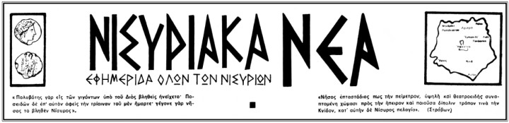 "Η Ένωση Συντακτών Ημερησίων Εφημερίδων Πελοποννήσου, Ηπείρου και Νήσων, θα βραβεύσει τον Γιάννη Διαμ. Χαρτοφύλη την Κυριακή 2 Νοεμβρίου στις 12 το μεσημέρι, στη Γιαννίδειο Νισυριακή Εστία, 3ης Σεπτεμβρίου 25 Αθήνα, γιατί, επί 32 συνεχή χρόνια, μόνος του, επιμελείτο της συντάξεως, εκδόσεως και διανομής, της εφημερίδας του συλλόγου Νισυρίων Αθηνών, ΝΙΣΥΡΙΑΚΑ ΝΕΑ.