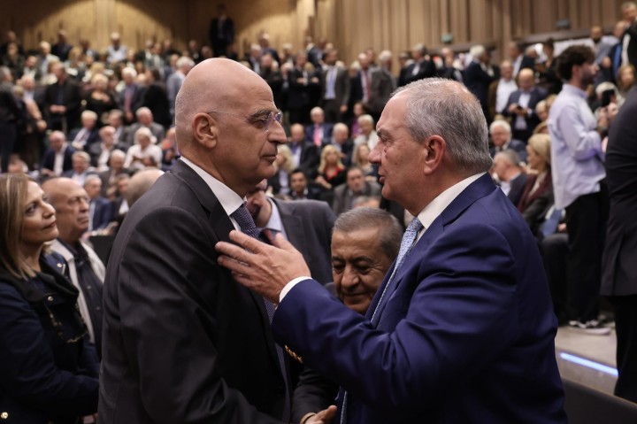 Κυριάκος Μητσοτάκης και Κώστας Καραμανλής, αντήλλαξαν χειραψία και μερικές κουβέντες λίγο προτού πάρουν τις θέσεις τους στη μπροστινή σειρά του αμφιθεάτρου.