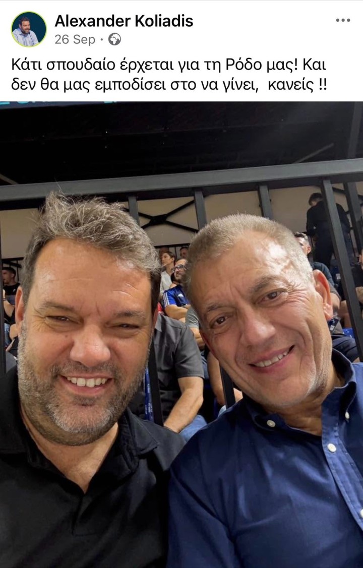 Σημειώνεται ότι πριν από μερικές εβδομάδες στο νησί μας βρέθηκε ο αναπληρωτής υπουργός Αθλητισμού κος Γιάννης Βρούτσης, με τον οποίο είχε συνάντηση (εντός γηπέδου) ο δήμαρχος Ρόδου, ανεβάζοντας μάλιστα σχετική φωτογραφία με τον Υπουργό στον προσωπικό του λογαριασμό στα μέσα κοινωνικής δικτύωσης κι επισημαίνοντας ότι «κάτι σπουδαίο έρχεται για τη Ρόδο μας και δεν θα μας εμποδίσει κανείς» στοιχείο που ίσως παραπέμπει στην σημερινή εξέλιξη.