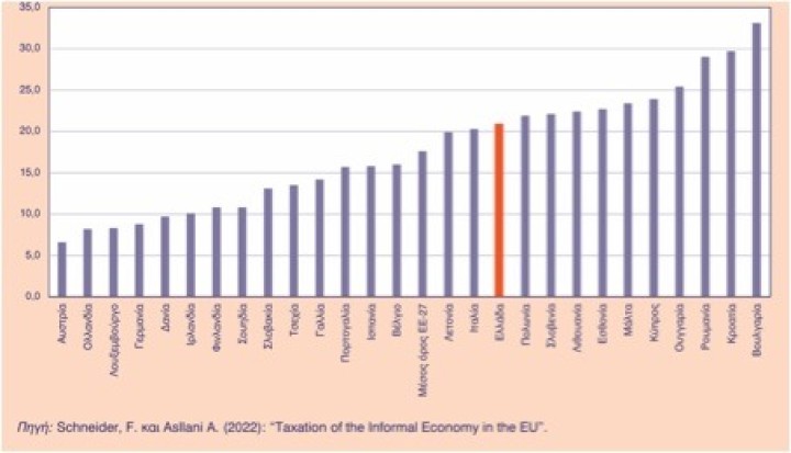 Σύμφωνα με την τελευταία - νέα μελέτη του Κέντρου Προγραμματισμού και Οικονομικών Ερευνών (ΚΕΠΕ), που δημοσιεύτηκε στις Οικονομικές Εξελίξεις, τεύχος 58 (Οκτώβριος 2025), η αδήλωτη οικονομική δραστηριότητα υπολογίζεται στο 20,9% του ΑΕΠ, δηλαδή περίπου 45–50 δισεκατομμύρια ευρώ για το 2022.