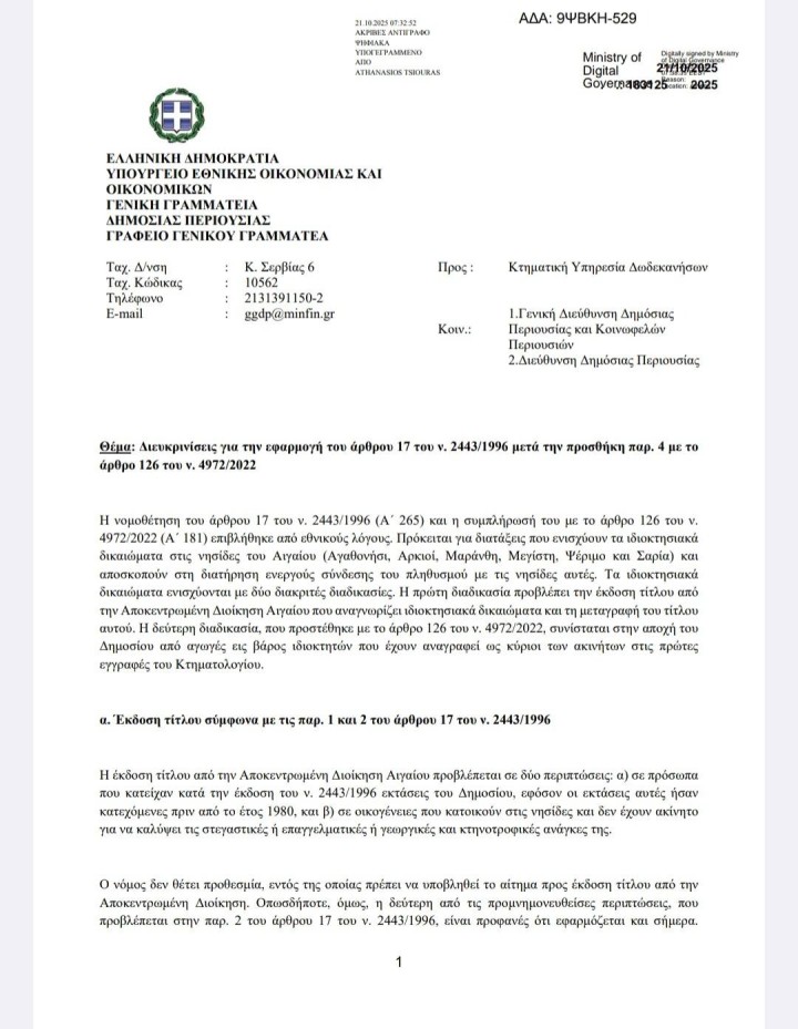 "Με επιμονή και σχέδιο: Ο αγώνας της Δημοτικής Αρχής δικαιώνει τους Αρκιούς και το Μαράθι Ιστορική στιγμή για τα ακριτικά νησιά Με μεγάλη ικανοποίηση ανακοινώνουμε ότι, ύστερα από συνεχή προσπάθεια, τεκμηριωμένες παρεμβάσεις και επίμονες διεκδικήσεις της Δημοτικής Αρχής, που περιελάμβαναν πολλά ταξίδια και συναντήσεις στο Υπουργείο Οικονομικών, τόσο σε επίπεδο πολιτικών όσο και υπηρεσιακών παραγόντων, εκδόθηκε σχετική εγκύκλιος από το Υπουργείο Εθνικής Οικονομίας και Οικονομικών, μέσω της Γενικής Γραμματείας Δημόσιας Περιουσίας.