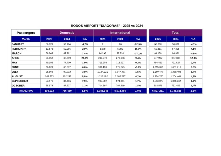 Συνολικά, από τον Ιανουάριο μέχρι και τον Οκτώβριο διακινήθηκαν μέσω του «Διαγόρας» 6.897.261 επιβάτες έναντι 6.738.928 το ίδιο διάστημα πέρυσι.
