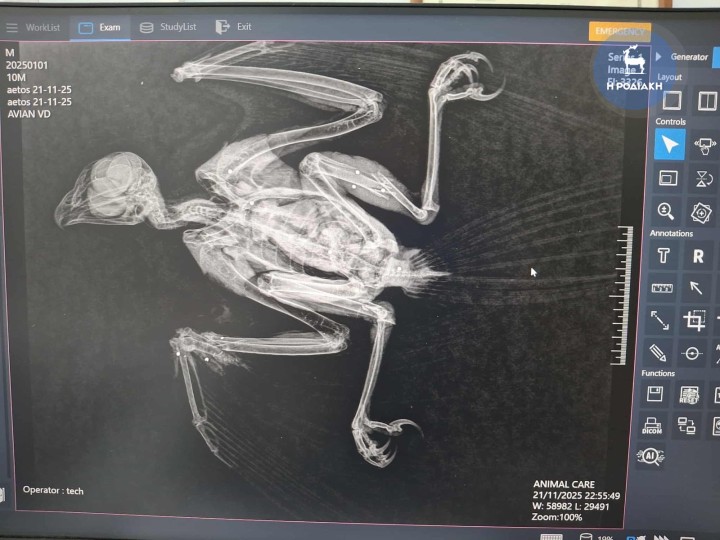 Όπως φαίνεται και στην ακτινογραφία που έγινε η γερακίνα είχε δεχθεί θανατηφόρα σκάγια από το κυνηγετικό όπλο, με αποτέλεσμα να σπάσουν και τα δύο φτερά καθώς επίσης και τα δύο της πόδια. Παρά την προσπάθεια που έγινε από τον συμπατριώτη μας κτηνίατρο, η γερακίνα πέθανε λίγη ώρα αργότερα.