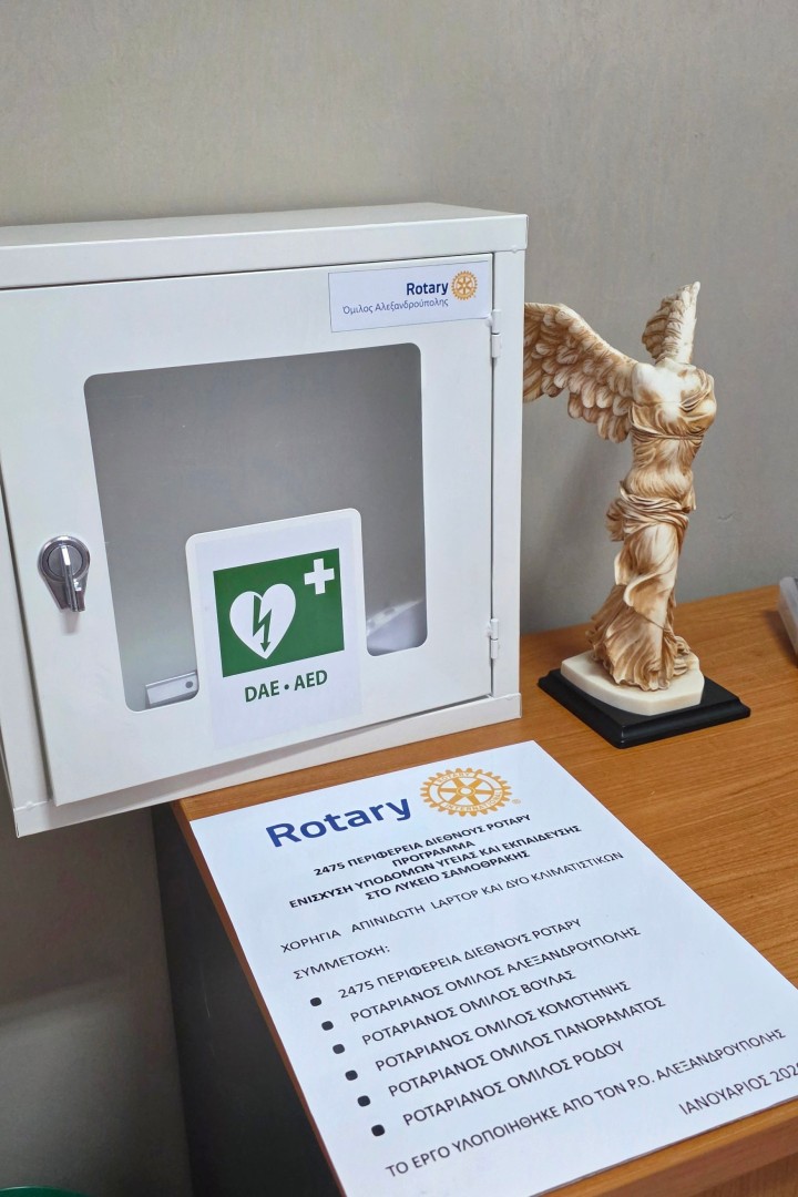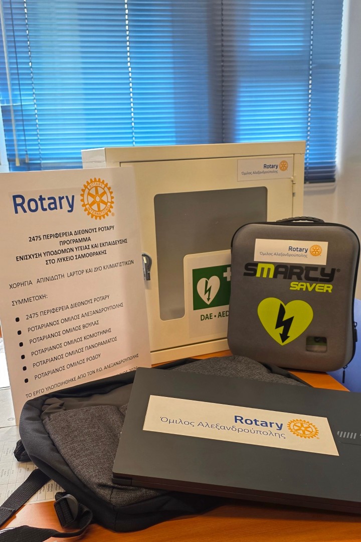 Ο Ροταριανός Όμιλος Ρόδου συμμετείχε οικονομικά στο πλαίσιο της υλοποίησης District Grand της 2475 Περιφέρειας του Διεθνούς Rotary που διοργάνωσε ο Ροταριανός Όμιλος Αλεξανδρούπολης, στο πλαίσιο του οποίου πραγματοποιήθηκε η παράδοση δύο κλιματιστικών μονάδων, ενός φορητού υπολογιστή (laptop) και ενός αυτόματου εξωτερικού απινιδωτή (AED) στο Λύκειο Σαμοθράκης.