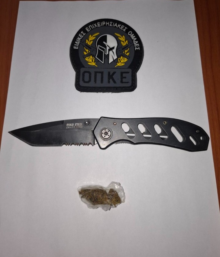 Οι ναρκωτικές ουσίες, το μαχαίρι και τα υπόλοιπα πειστήρια κατασχέθηκαν.